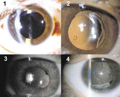 Figura 1. 1: Catarata polar anterior. 2: Catarata piramidal. 3, 4 y