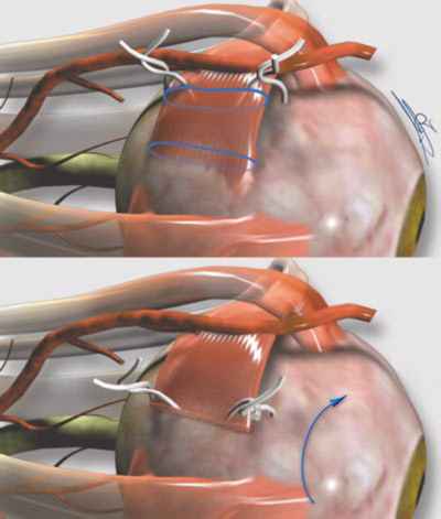 2. Operación de Harada-Ito Esta intervención consiste en acortar selectivamente las fibras anteriores del tendón del músculo oblicuo superior (estas fibras son inciclotorsoras, mientras que las fibras posteriores son principalmente depresoras), para así reforzar la inciclotorsión. Para ello se diseca la mitad anterior del tendón distal y se reinserta avanzando sobre su eje y además hacia adelante. Hay que tender a la hipercorrección, porque estos refuerzos tienden a ceder y a producir resultados pobres (figura 8). Esta técnica debe realizarse con suturas no reabsorbibles.