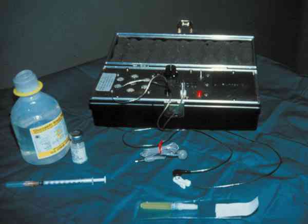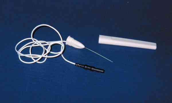 • Electromiógrafo o amplificador de electromiografía (EMG). Se debe probar el EMG y la punta de los electrodos. Hay autores que no lo utilizan. Los grandes aparatos de EMG son mejores que los pequeños amplificadores pero, desde el punto de vista práctico, la mayoría utilizamos el amplificador de EMG (43,52,66,89). • Electrodos para el EMG. • Agujas especiales de EMG: 27 G, monopolares. En el caso de no usar EMG, se hace con agujas de insulina (figura 6).