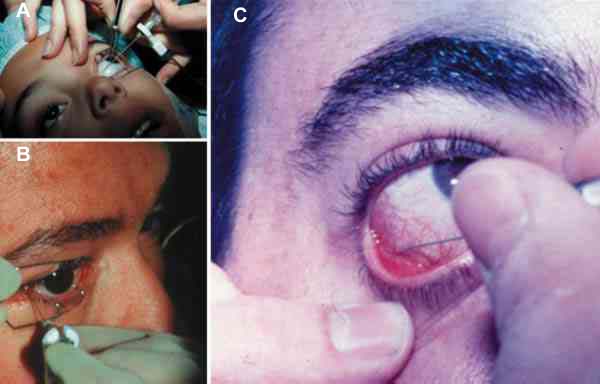 3. Dolor En algunas ocasiones los pacientes se quejan de dolor. Unas veces se produce en el momento de la inyección y otras persiste, aunque con menor intensidad, durante 1-2 días. Hay varias maniobras que son dolorosas, como coger la carúncula con la pinza para inyectar, introducir la aguja en pacientes operados, con tejidos fibróticos o con gran contractura muscular, rozar el periostio con la aguja, o inyectar el líquido de manera muy brusca. Aconsejamos introducir la aguja lateralmente al músculo, evitar las zonas de cicatrices en los pacientes operados, e inyectar el líquido lentamente. También se puede inyectar una pequeña cantidad de lidocaína subconjuntival antes de administrar la TBA, para que ésta sea menos dolorosa en pacientes con muchas cicatrices.