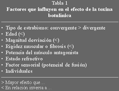 Al inyectar TBA en un músculo extraocular se induce un desequilibrio de fuerzas entre los músculos antagónicos. Este desequilibrio es transitorio. Se produce una hipercorrección de la desviación, también transitoria, que poco a poco va disminuyendo a medida que el músculo recupera la actividad contráctil. Este periodo de hipercorrección es fundamental para la resolución del estrabismo. Si ha sido suficientemente duradero, se obtiene un buen resultado en un porcentaje elevado de casos (33,34,36). En otros, vemos que la alineación es pasajera y que recidiva el ángulo aunque, en general, en menor cuantía que al principio. En ese momento se debe plantear si se debe reinyectar o corregir el defecto residual mediante cirugía. Al principio se pensaba que el efecto se basaba, exclusivamente, en modificaciones mecánicas, y que la relación dosis-respuesta debería ser bastante lineal. Hoy pensamos que influyen varios factores en cada individuo y, por ello, la respuesta puede ser variable: • Factores mecánicos: durante el periodo de hipercorrección, el músculo inyectado está relajado y elongado, y el antagonista, contraído. Este desequilibrio temporal puede inducir cambios de fuerzas, de la relación longitud-tensión, incluso con reorganización ultraestructural de las sarcómeras. Estas modificaciones pueden ser variables en cada caso, en función de varios factores: la duración de la hipercorrección, el grado de contractura o espasmo inicial, el grado de fibrosis, la edad del individuo y el tipo de músculo (recto medio, recto lateral, etc.). • Factores sensoriales: modificaciones que se inducen durante el periodo de hipercorrección y que varían según el tipo de trastorno oculomotor. • Factores propioceptivos. • Factores individuales de respuesta frente a la TBA.