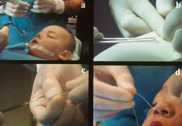 endoscópica de ambas sondas en la fosa nasal, antes de anudarlas. c: Las sondas