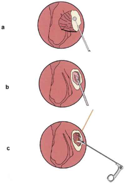 tijeras (figura 9b). A continuación, se extirpa toda la pared medial del saco