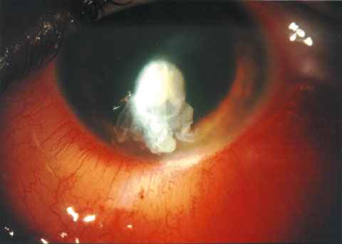 FORMA NECRÓTICA DE QUERATITIS INFECCIOSA EN UNA PACIENTE DE 17 AÑOS PORTADORA DE LC DESECHABLES DESDE HACE 2 AÑOS. ACUDE POR DOLOR Y DISMINUCIÓN DE VISIÓN PROGRESIVA EN OD DE 2 DÍAS DE EVOLUCIÓN. LOS CULTIVOS DEMOSTRARON EL CRECIMIENTO DE 2 CEPAS DIFERENTES DE PSEUDOMONA AERUGINOSA.