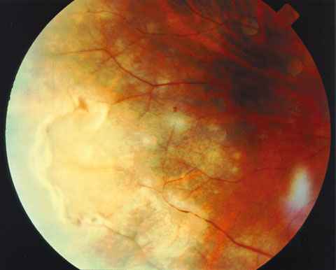 DESGARRO EN RETINA PERIFÉRICA COINCIDENTE CON LA APARICIÓN DE RETINITIS PERIFÉRICA EN LA RETINA TEMPORAL DEL OJO DERECHO.