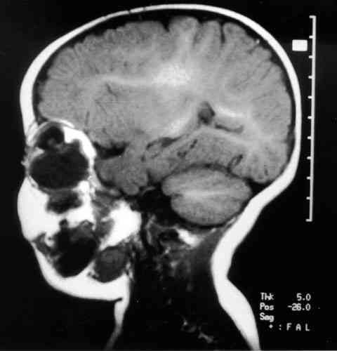 RESONANCIA NUCLEAR MAGNÉTICA EN T1, CORTE SAGITAL ÓRBITA DERECHA, DONDE PODEMOS OBSERVAR TUMORACIÓN INTRAORBITARIA QUÍSTICA EN ÍNTIMO CONTACTO CON EL GLOBO OCULAR. EL CONTENIDO QUÍSTICO PARECE DE DENSIDAD SIMILAR AL LCR.