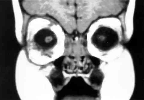 RESONANCIA NUCLEAR MAGNÉTICA EN T1, CORTE CORONAL CON NORMALIZACIÓN DEL TAMAÑO ORBITARIO TRAS TRES MESES DE LA EXTIRPACIÓN DEL QUISTE COLOBOMATOSO.