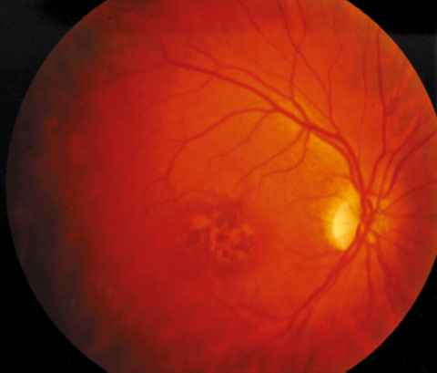 RETINOGRAFÍA OJO DERECHO. DISTROFIA MACULAR CON BLANQUECIMIENTO DE LA PAPILA TEMPORAL.