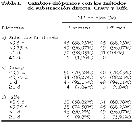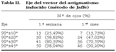 En la tabla I mostramos el número de ojos que presentaban un astigmatismo inducido inferior a 0,5, 0,75 y 1 dioptría, así como el igual o superior a 1 dioptría. Como se aprecia el astigmatismo inducido fue inferior a 1 dioptría tras el primer mes en el 100% de los ojos para el método de substracción directa, el 94% de los ojos con el método de Cravy, y el 96,07% para el método de Jaffe.
