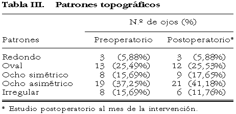 Bogan publicó en 1990 una clasificación topográfica de ojos normales en 4 grupos según el mapa de colores: patrón redondo, oval, ocho simétrico, ocho asimétrico, y finalmente un grupo indefinido o irregular (3). Nosotros hemos analizado estos patrones y no hemos encontrado que tengan relación con el astigmatismo inducido, ni siquiera el grupo ocho simétrico o asimétrico que tiene en el trabajo de Bogan más astigmatismo que los demás grupos. Sólo 7 ojos cambiaron de grupo, de los que 6 se modificaron hacia otro grupo cercano.