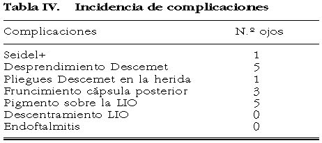 Finalmente indicar el bajo número de complicaciones de esta técnica (tabla IV): sólo en un caso tuvimos Seidel y en pocos casos tuvimos un leve desprendimiento de la Descemet, que no necesitaron ninguna medida al reaplicarse la Descemet en el postoperatorio.