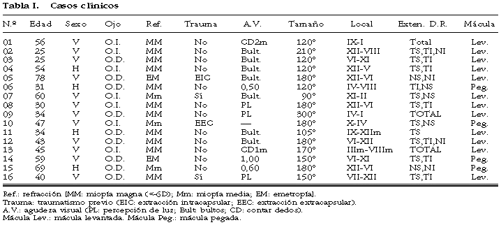 Se presentan 16 ojos afectos de desgarro gigante de 15 pacientes con edades comprendidas entre los 25 y 78 años (edad media: 47 años). De los 15 pacientes, 11 eran varones (73,3%) y 4 mujeres (26,6%), presentando 10 pacientes miopía magna 11 ojos, 3 miopía media y 2 emetropía. El antecedente de contusión ocular estaba presente en 2 casos y en otros 2 existía el antecedente de cirugía ocular previa (extracción de cataratas).