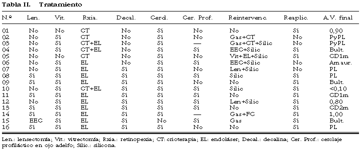 La cirugía practicada incluyó vitrectomía en 14 casos junto con lensectomía en 6 de ellos y una extracción extracapsular (EEC); se colocó además cerclaje en 15 ojos y cerclaje profiláctico en el ojo adelfo en 8 casos.