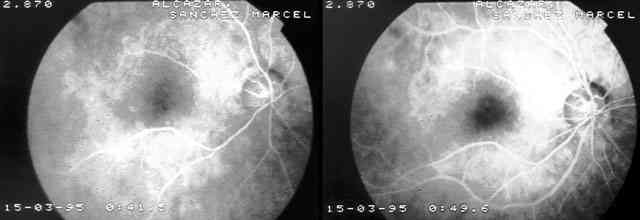 CASO 1: 4 DÍAS POST-INYECCIÓN PERIBULBAR. NORMAL RELLENO COROIDEO PERO CON RETRASO MARCADO DEL RELLENO ARTERIAL Y UN INCREMENTO DEL TIEMPO DE TRÁNSITO ARTERIO-VENOSO.