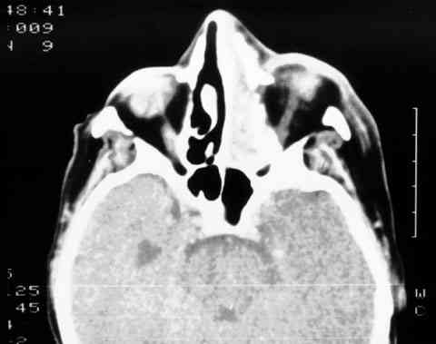 T.A.C. QUE REVELA LA OCUPACIÓN DE LA FOSA NASAL, EL SENO ETMOIDAL Y PARTE DE LA ÓRBITA IZQUIERDA.