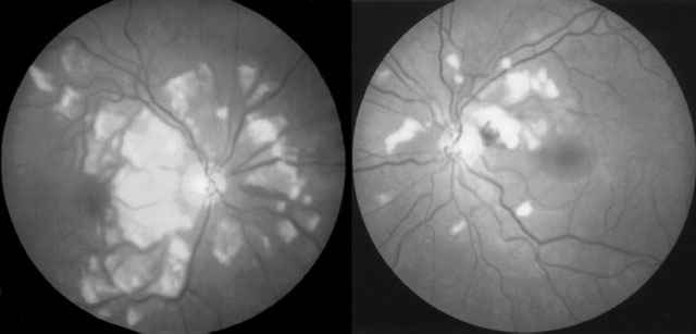 EDEMA BLANQUECINO DIFUSO INTRARRETINIANO DE AMBOS POLOS POSTERIORES Y NASAL A PAPILA, MÁS MARCADO EN OD. HEMORRAGIAS RETINIANAS AISLADAS AO.