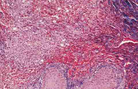 SARCOMA DE KAPOSI. NEOPLASIA COMPUESTA POR UN ESTROMA ESPONJOSO, CON ESPACIOS VASCULARES IRREGULARES, DELINEADOS POR CÉLULAS FUSIFORMES MALIGNAS (MASSON'S TRICHROME, 500x).