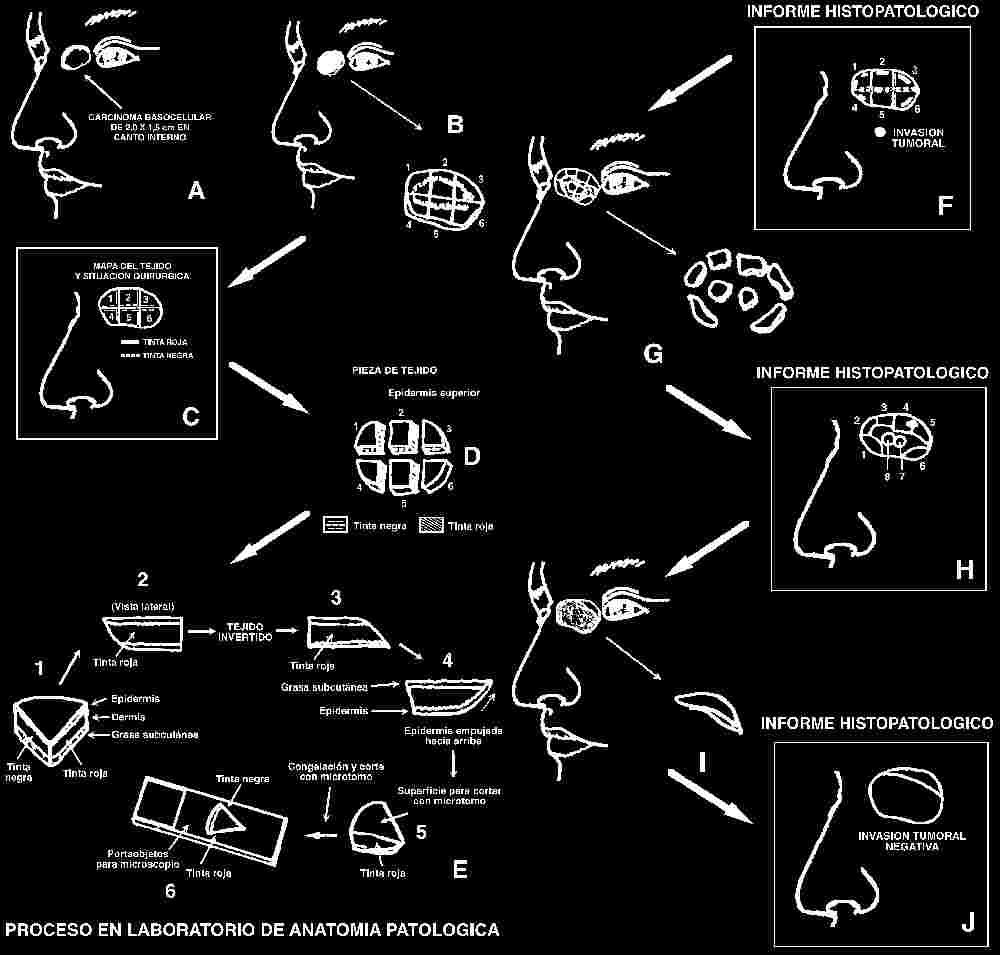 ESQUEMA ESTÁNDAR DE CIRUGÍA MICROGRÁFICA DE MOHS. A) LOCALIZACIÓN Y DELIMITACIÓN DEL TUMOR. B) EXTIRPACIÓN DEL TUMOR VISIBLE MACROSCÓPICAMENTE. RESECCIÓN DE LOS MÁRGENES EN PROFUNDIDAD DE TODA LA LESIÓN. FRAGMENTACIÓN DE LA PIEZA PARA ESTUDIO HISTOPATOLÓGICO. C) MAPA DE LA PIEZA. D) TINCIÓN DE LOS BORDES VERTICALES EN NEGRO Y DE LOS VERTICALES EN ROJO. E) PROCESADO EN EL LABORATORIO DE ANATOMÍA PATOLÓGICA. 1 Y 2. IDENTIFICACIÓN DE EPIDERMIS EN LAS PIEZAS. 3. INVERSIÓN DE LA PIEZA, EXPONIENDO LA SUPERFICIE PROFUNDA. 4. EXPOSICIÓN DEL BORDE EPIDÉRMICO EXTERNO. 5. CORTE CON MICROTOMO DE LA CARA PROFUNDA CON EPIDERMIS. 6. TINCIÓN Y ESTUDIO MICROSCÓPICO DE LA PIEZA. F) MAPA CON INDICACIÓN DE LA INVASIÓN TUMORAL. G) RESECCIÓN DE LOS BORDES INFILTRADOS. H) MAPA DE LA INFILTRACIÓN TUMORES DE LOS BORDES REMITIDOS. I) NUEVA RESECCIÓN DEL BORDE INFORMADO COMO INFILTRADO. J) MAPA DE LOS BORDES DE RESECCIÓN INFORMANDO DE LA AUSENCIA DE INFILTRACIÓN TUMORAL. YA SÓLO QUEDA REALIZAR LA RECONSTRUCCIÓN TUMORAL.