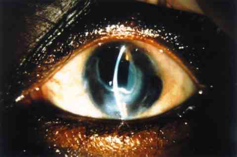 OJO IZQUIERDO DE VARÓN ANGOLEÑO DE 30 AÑOS CON ÚLCERA DE MOOREN BILATERAL. SE APRECIA PERFORACIÓN OCULAR CON HERNIA DE IRIS TEMPORAL Y PROGRESIÓN CENTRAL DE LA ÚLCERA.