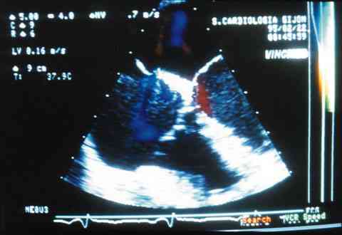 ECOCARDIOGRAMA TRANSESOFÁGICO PREVIA INTRODUCCIÓN DE CONTRASTE, EN EL QUE SE PUEDE APRECIAR EL TRÁNSITO INTERCAVITARIO CON LA MEZCLA DE TONOS.
