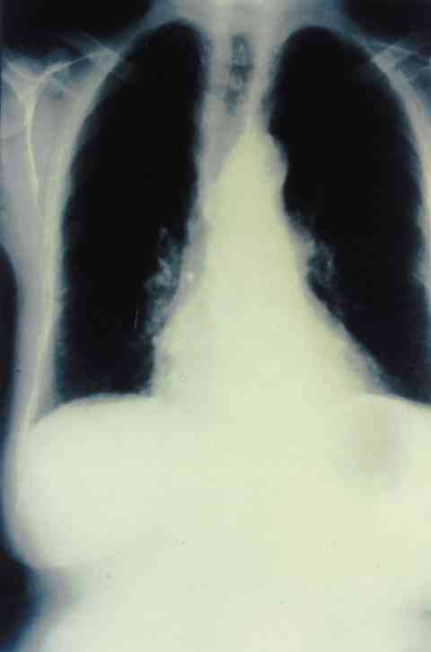 RX TÓRAX EN LA QUE SE OBSERVAN ADENOPATÍAS HILIARES JUNTO A UN PATRÓN INTERSTICIAL EN AMBAS BASES PULMONARES.