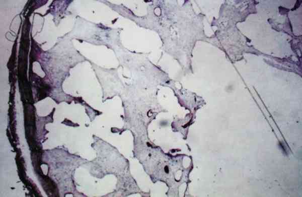 SECCIÓN HISTOLÓGICA DEL IMPLANTE DEL CONEJO N.º 3. NÓTESE QUE EL TERCIO INTERNO ESTÁ LIBRE DE VASCULARIZACIÓN Y SÓLO SE APRECIAN ALGUNAS CÉLS. INFLAMATORIAS AISLADAS (TINCIÓN H&E, 4X).