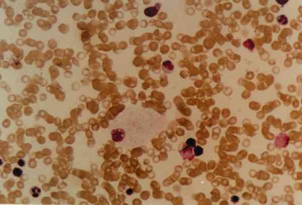 ASPECTO DE LA PUNCIÓN DE LA M. ÓSEA EN NUESTRO PACIENTE, MEDIANTE LA TINCIÓN DE MAY-GRÜNWALD-GIEMSA, DONDE APRECIAMOS UNA CÉLULA ESPUMOSA.