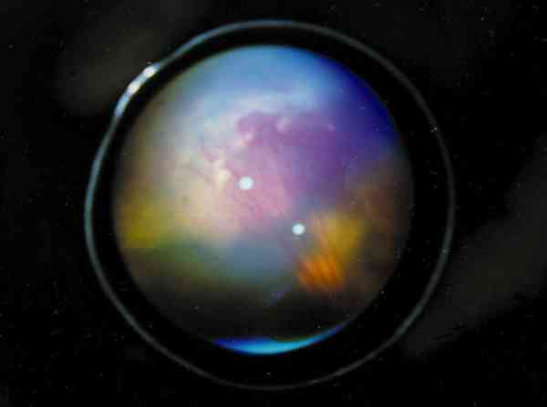 FONDO DE OJO IZQUIERDO DEL CASO PROBLEMA DONDE SE OBSERVA LA EXUDACIÓN SUBRETINIANA, MASA FIBROVASCULAR TEMPORAL Y PLIEGUE RETINIANO FALCIFORME CON VASOS RECTIFICADOS QUE DESDE PAPILA SE DIRIGEN A LA MASA FIBROVASCULAR.