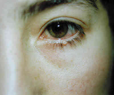 CASO 11. MOLLUSCUM CONTAGIOSIUM EN BORDE DE PÁRPADO INFERIOR, ASOCIADO A LA CLÁSICA CONJUNTIVITIS FOLICULAR.