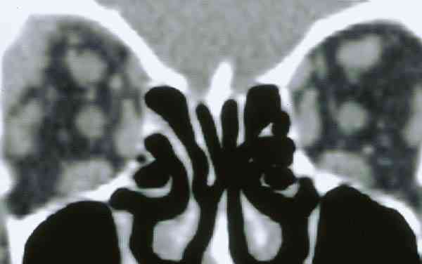 TAC: MASA QUE OCUPA EN EL ESPACIO RETROBULBAR LA ZONA TEMPORAL-SUPERIOR. OCUPACIÓN DEL ETMOIDES.