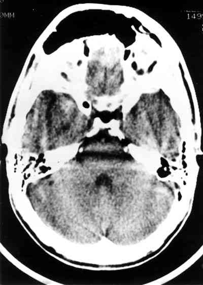 PROYECCIÓN AXIAL DE TAC CRANEAL MOSTRANDO LA CAVIDAD FRONTAL DERECHA HIPERNEUMATIZADA HACE 7 AÑOS Y PREVIA LA INTERVENCIÓN.