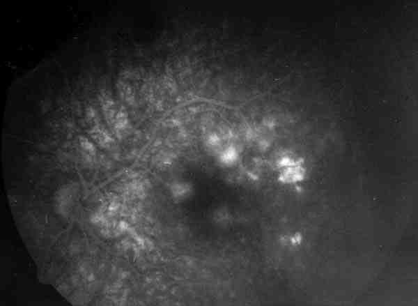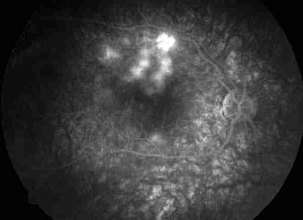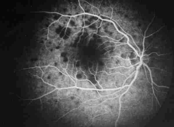 ANGIOGRAFÍA DE AMBOS OJOS EN LA QUE SE PUEDE VER EL EFECTO VENTANA DE LAS LESIONES EN LAS FASES TEMPRANAS Y SU HIPERFLUORESCENCIA TARDÍA EN AMBOS OJOS.