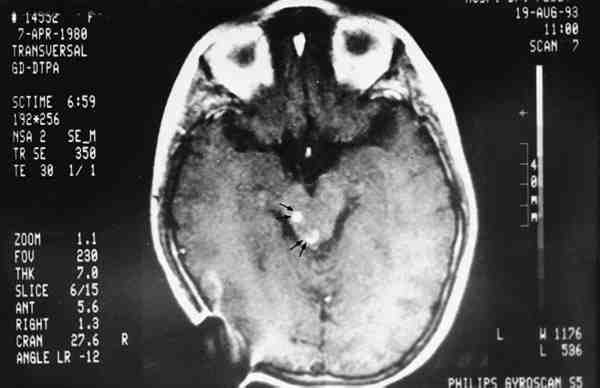 LESIONES GOMATOSAS (HIPERDENSAS TRAS INYECTAR CONTRASTE) A NIVEL MESENCEFÁLICO. NO HAY PATOLOGÍA EN LOS NERVIOS ÓPTICOS. IMAGEN DE TAC.