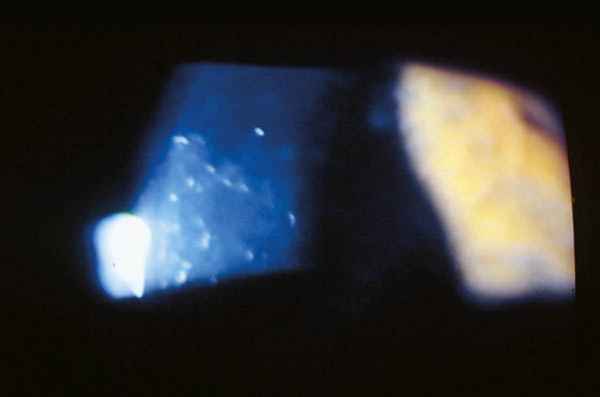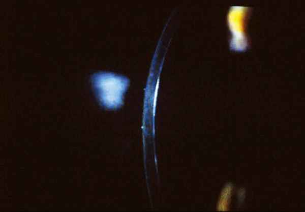 A) SE PUEDE OBSERVAR LAS OPACIDADES CORNEALES QUE DAN EL ASPECTO TÍPICO DE VIDRIO DESLUSTRADO, GRIS-AZULADO. B) AL CORTE BMC SE APRECIA UN REFUERZO DE LA CARA POSTERIOR SIN EDEMA, SIN AUMENTO DE GROSOR.