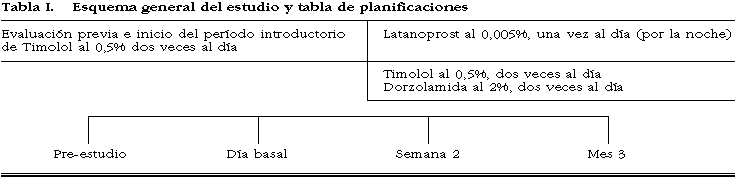 El día de la primera visita, visita basal, los pacientes elegibles se asignaron a uno de los dos grupos de tratamiento de forma aleatoria. Un grupo de pacientes recibió Latanoprost al 0,005% una vez al día, por la noche, mientras que el otro grupo de tratamiento recibió Dorzolamida al 2%, dos veces al día, y Timolol al 0,5%, dos veces al día. La duración del período de tratamiento fue de 3 meses e incluyó 3 visitas: la visita basal y una visita a las 2 semanas y a los 3 meses del inicio del estudio, respectivamente (tabla I).