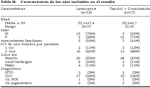 Se han incluido en el presente estudio un total de 35 pacientes de los cuales 18 sujetos han sido asignados al grupo de tratamiento con Latanoprost, y los 17 sujetos restantes al grupo de Timolol más Dorzolamida.