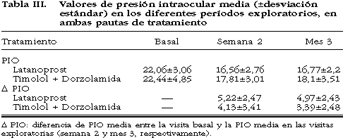 Comparando ambas pautas de tratamiento, el Latanoprost ha evidenciado un efecto hipotensor 1,09 y 1,58 mm Hg mayor que el Timolol + Dorzolamida a las 2 semanas y 3 meses de seguimiento, respectivamente, siendo estas diferencias casi significativas (p<0,1) (tabla III).