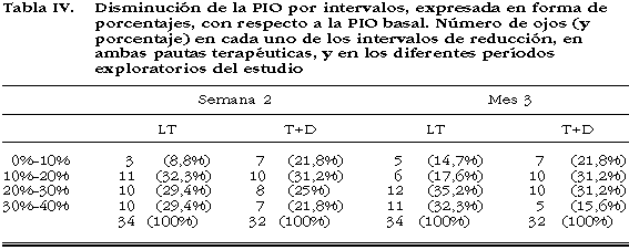 Analizando la disminución de PIO por intervalos, expresada en forma de porcentajes, se observa cómo a las 2 semanas del inicio del tratamiento, 10 (29,4%) de los 34 ojos incluidos en el grupo de Latanoprost presentaron una reducción de PIO superior al 30% con respecto a los valores basales, mientras que en el grupo de Timolol + Dorzolamida se observó una disminución de PIO superior al 30% en 7 (21,8%) de los 32 ojos incluidos en este grupo (tabla II). Al final del período de estudio (3 meses), este porcentaje aumenta a un 32,3% (11 de 34) en el grupo de Latanoprost, mientras que por el contrario disminuye a un 15,6% (5 de 32) en el grupo de Timolol + Dorzolamida (tabla IV).