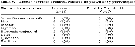 Los síntomas subjetivos y los signos exploratorios consignados durante el estudio quedan reflejados en la tabla V. En ninguno de los grupos de tratamiento se evidenciaron efectos adversos oculares importantes.