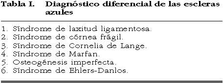 El diagnóstico diferencial de la osteogénesis imperfecta se realiza con una serie de patologías (tabla I). Siempre habrá que descartar algunos signos característicos como el síndrome de ligamentos laxos aislado, el síndrome de «brittle cornea» (córnea «reluciente» y pelo rojo) (10), el síndrome de Cornelia de Lange (retraso mental, retraso del crecimiento y anomalías esqueléticas sin escleras azules) (11), el síndrome de Marfan congénito (megalocórnea, iris alterado y mal desarrollo de los cuerpos ciliares) (12).
