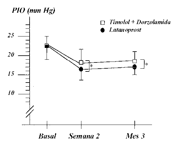 EFECTO DEL LATANOPROST AL 0,005% UNA VEZ AL DÍA (POR LA NOCHE) O DE LA DORZOLAMIDA AL 2%, DOS VECES AL DÍA, MÁS TIMOLOL AL 0,5%, DOS VECES AL DÍA, SOBRE LOS VALORES DE PIO (MEDIA±ds) (*: p<0,1).