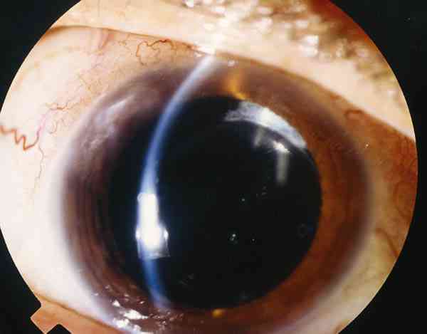 IMAGEN BIOMICROSCÓPICA EN LA QUE SE APRECIA UNA ÚNICA PLACA BLANQUECINA EN EL SACO CAPSULAR AL INICIO DEL CUADRO CLÍNICO.