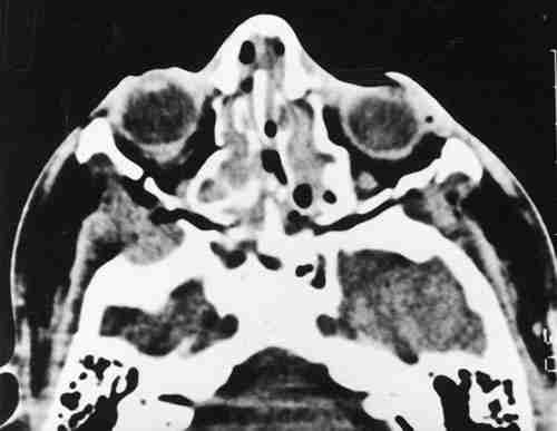 T.A.C. ORBITARIA DONDE SE APRECIAN MÚLTIPLES FRACTURAS FACIALES Y ORBITARIAS.