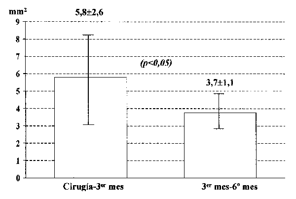 COMPARACIÓN DE LA SUPERFICIE DE OSTEOTOMÍA CERRADA (EN MM2) EN LOS TRES PRIMEROS MESES Y DESDE EL TERCER AL SEXTO MES.