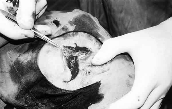INSTANTE QUIRÚRGICO EN EL QUE SE OBSERVA QUE LA TUMORACIÓN HA SIDO RESECADA Y SE HA REALIZADO UN COLGAJO SEMICIRCULAR PARA CORREGIR LA SOLUCIÓN DE CONTINUIDAD PRODUCIDA AL ESCINDIR LA NEOPLASIA.