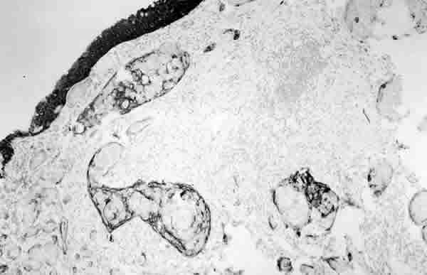 INMUNOREACTIVIDAD PARA LA CITOQUERATINA. OBSÉRVESE COMO LAS CÉLULAS TUMORALES QUE SE DISPONEN EN NIDOS ASÍ COMO EL EPITELIO NORMAL SE TIÑEN DE OSCURO, QUE CORRESPONDE A LA TINCIÓN MARRÓN CON PEROXIDASA (PEROXIDASA).
