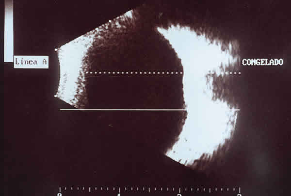 ECOGRAFÍA B DEL OJO IZQUIERDO EN LA QUE SE APRECIA UN LEVANTAMIENTO PAPILAR HIPERECOGÉNICO.