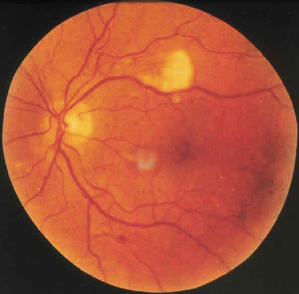 FONDO DE OJO IZQUIERDO. SE APRECIA UNA RETINOPATÍA DIABÉTICA INICIAL EN LA QUE DESTACA LA APARICIÓN DE UN GRAN EXUDADO ALGODONOSO QUE TRADUCÍA UN ACCIDENTE VASCULAR SEVERO.