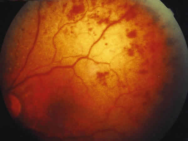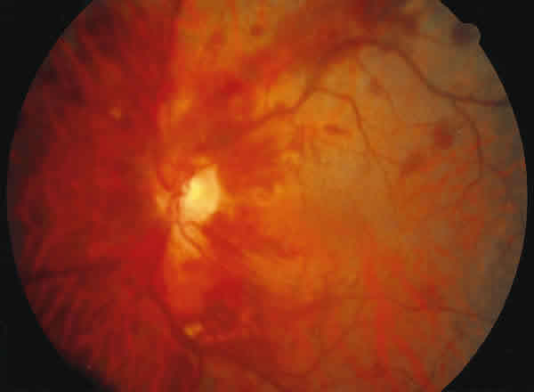 Las disproteinemias como la macroglobulinemia de Waldenström, mieloma múltiple, linfomas o gammapatías monoclonales benignas ocasionan un cierto grado de isquemia retiniana secundaria a la hiperviscosidad que provocan, pero sin llegar a grados de isquemia severos ya que son enfermedades asociadas a anemias con lo que el aumento de la viscosidad no es de gran magnitud (1). El grado de retinopatía por hiperviscosidad está en relación con la severidad de ésta. Clínicamente se detecta dilatación venosa, formación de microaneurismas en retina periférica y media periferia, hemorragias retinianas y edema retiniano, llegando en casos severos a desprendimientos de retina exudativos (2,3). De entre ellas, la enfermedad de Waldenström es la que cursa con una hiperviscosidad mayor, originando un cuadro clínico dificil de diferenciar de una obstrucción de vena central de la retina, aunque la existencia de la enfermedad subyacente, su bilateralidad asociada a una menor tortuosidad venosa sin disminución del calibre arteriolar nos ayudarán al diagnóstico. En algunos casos puede asociarse a neovascularización retiniana periférica.