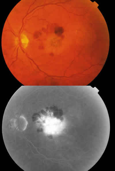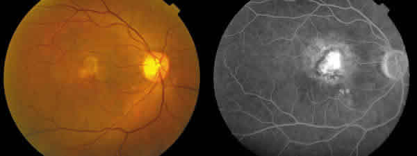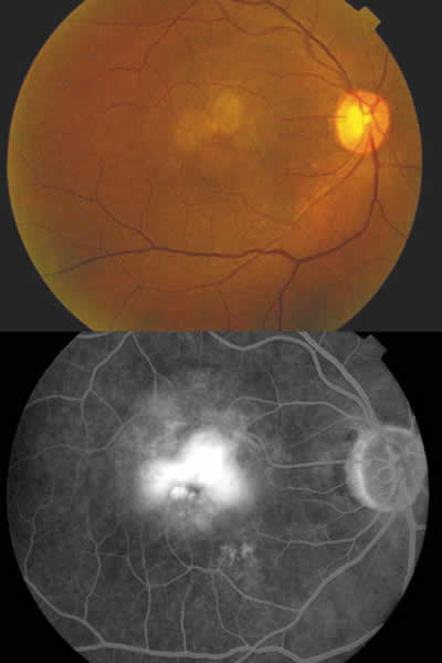 Fig. 3. Lesión subfoveal mínima clásica con membrana activa. AV=0,4.